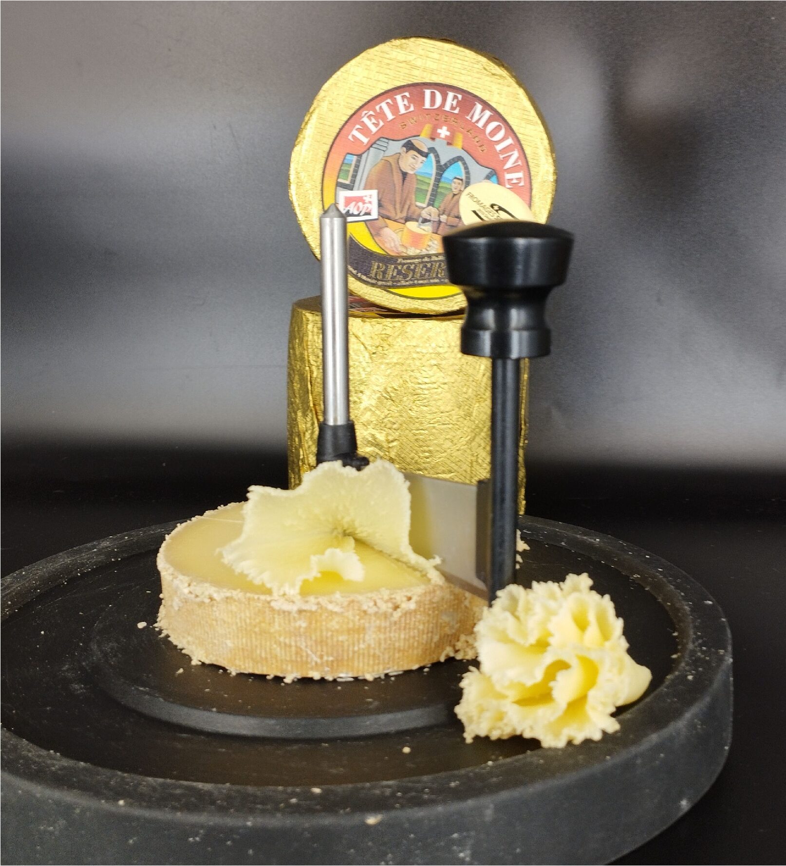 Charakterystyczny sposób serwowania Tête de Moine – skrawanie w formie dekoracyjnych rozet lub tzw różyczek za pomocą girolle – pozwala w pełni uwolnić aromaty sera i podkreślić jego aksamitną teksturę.