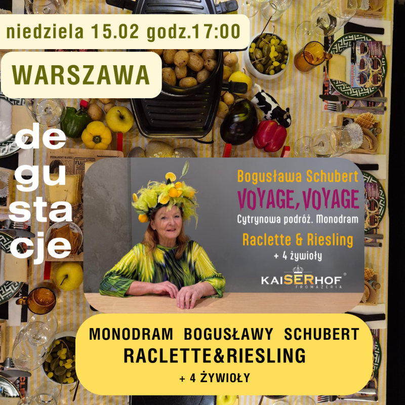 Rozpoczniemy monodramem – podróżą Bogusi Schubert „Voyage,Voyage Cytrynowa Podróż”. Wzruszające przeżycie z aktorką oko w oko podczas jej opowieści o zawiłym świecie aktorskim, podróżach po Afryce i pobycie w Paryżu. Drugą częścią naszego wydarzenia będzie degustacja komentowana Kuby Maziarczyka – światowego specjalisty od serów i jurora międzynarodowego. Zabierze nas w podróż po 3 krajach z Raclette i 3 krajach z winami Riesling. Całość w lekkiej, humorystycznej formie z dawką wiedzy ale też ciekawostek na temat tego ciągnącego się sera. Na koniec sprawdzian „jaki się jest żywiołem?”. To jak zasiądziemy wspólnie przy jednym stole?